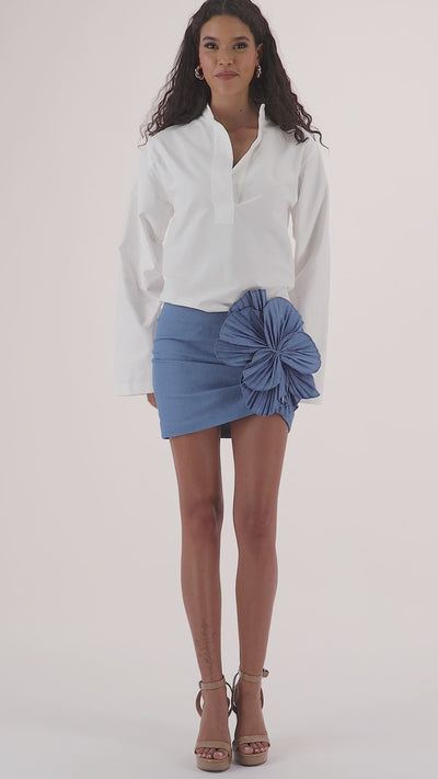 The 'Aati Mini skirt'— is designed to turn heads, crafted from blue denim and adorned with the CECE signature pleated flower, it pairs perfectly with the Aati top for an unforgettable night out or the Pati white shirt for the perfect brunch outfit