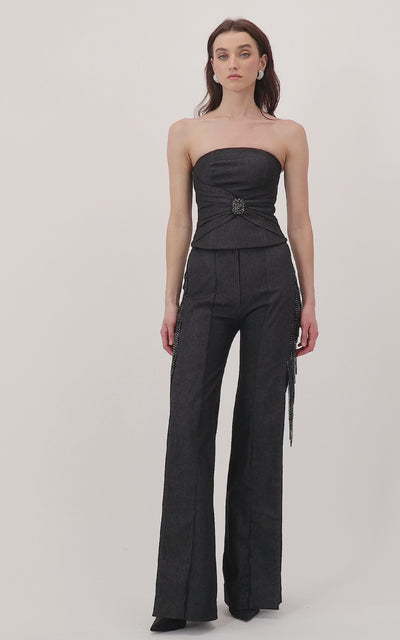 Charcoal grey denim pants designed with contoured panels flowing from the front to the sides, linked by striking chain detailing. Structured yet daring, this fashion-forward piece brings edge and movement to elevated casual looks, ideal for daytime events, stylish gatherings, and modern day-to-night dressing.