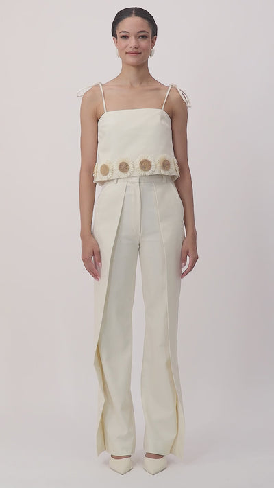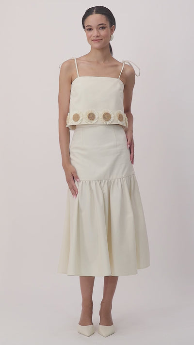 For the playful feminine side of you we present the ' Daisy top' . It is crafted from off-white cotton denim and decorated with daisy raffia flowers.  A go-to for birthdays, special brunches, parties, and much more.