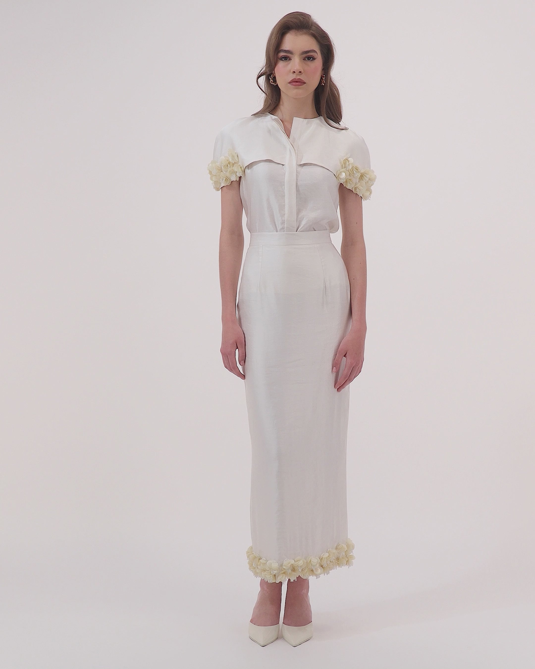 The Ivory skirt featuring the epitome of elegance. Delicately cut from luxurious glazed linen, this skirt boasts a timeless allure. What sets it apart? Intricate floral embroidery adorns the hem, adding a touch of whimsy and charm to elevate your ensemble. Whether you're strolling through sunlit gardens or attending a soirée, our Ivory Skirt promises to enchant with its effortless sophistication. Match it with the Ivory top for the full look.