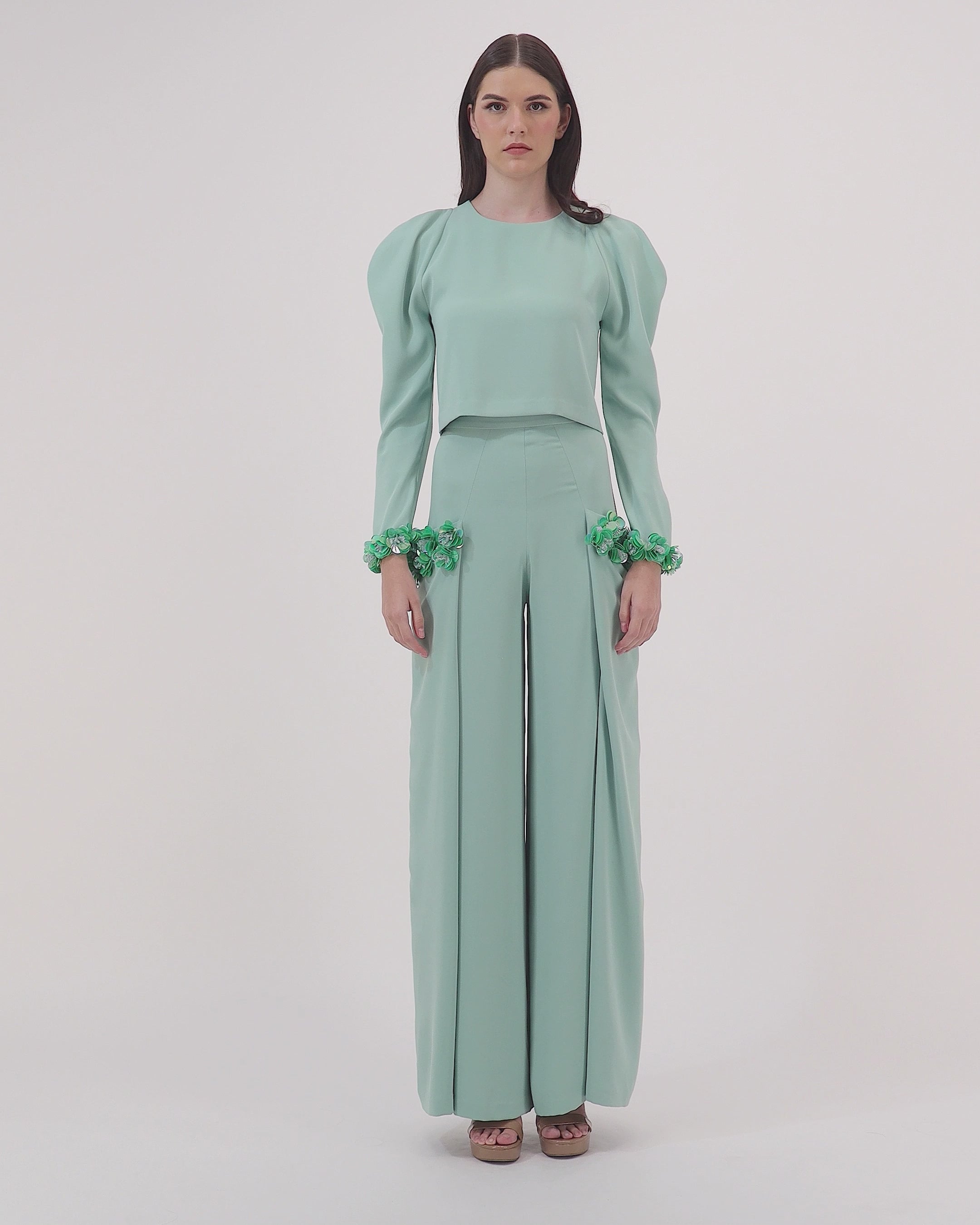Introducing the Jade top, the epitome of seasonal style. Crafted from luxurious crepe fabric in the color of the season, this top exudes fresh elegance. Delicate embroidered flowers adorn the sleeves, adding a touch of natural beauty. Versatile and chic, it's the perfect statement piece for any occasion.