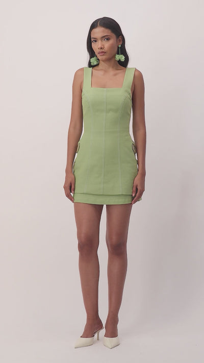 Pistachio green denim set pairing a side-slitted long top with an A-line mini skirt. The sleeveless top features circular buckles along the slits and a double-stitch detailing. A classic silhouette with a playful twist.