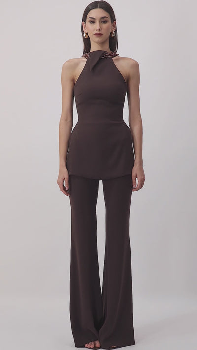 Elevate your wardrobe with this chic halter crepe top, featuring an elegant chain detail around the neckline for a modern and sophisticated touch. The sleek silhouette and luxurious fabric make it a versatile piece, ideal for both casual outings and evening events.
