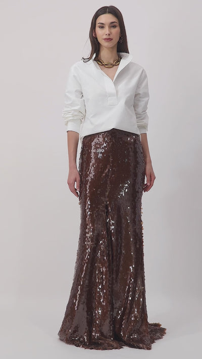 Shimmer in style with this stunning maxi flow sequin skirt, embracing the color of the season with a touch of glamour. Designed with a flowing silhouette, it moves effortlessly with every step, making it perfect for special occasions or evening events. Pair it with a sleek white shirt, fashion-forward ensemble that captures elegance and modernity.