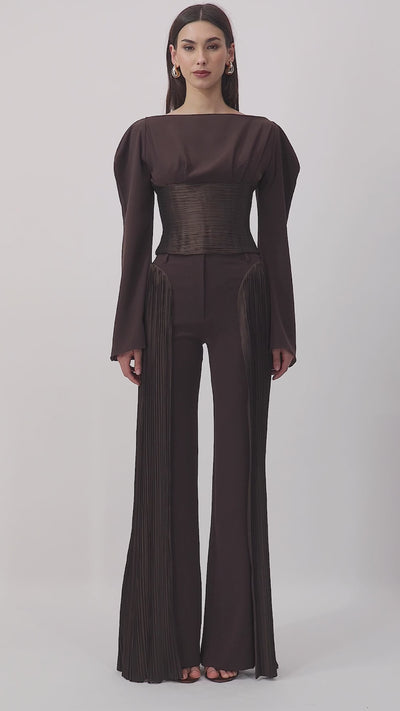This perfectly pleated fitted top is sleek and exquisite with couture-level tailoring . Crafted from specially pleated taffeta —style yours with the Runa pants for that special occasion .