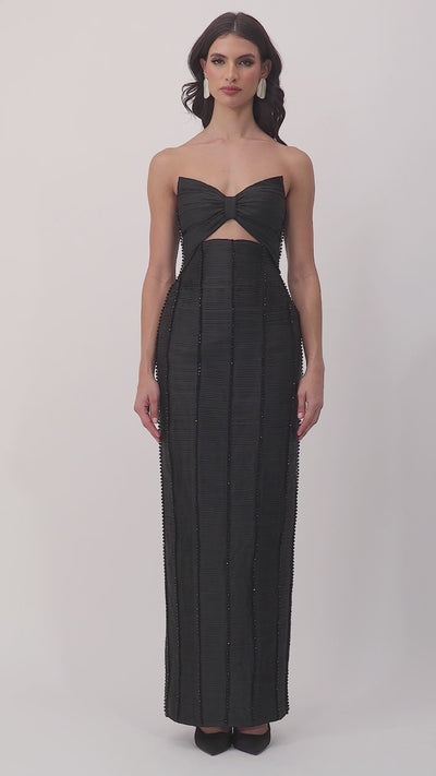 Turn heads in this striking black 'Adelyn' gown. Featuring a knotted bodice with a chic front cut-out and a sleek column silhouette, it’s adorned with delicate vertical beadwork for a touch of understated glamour. Perfect for evening soirées and elegant affairs.