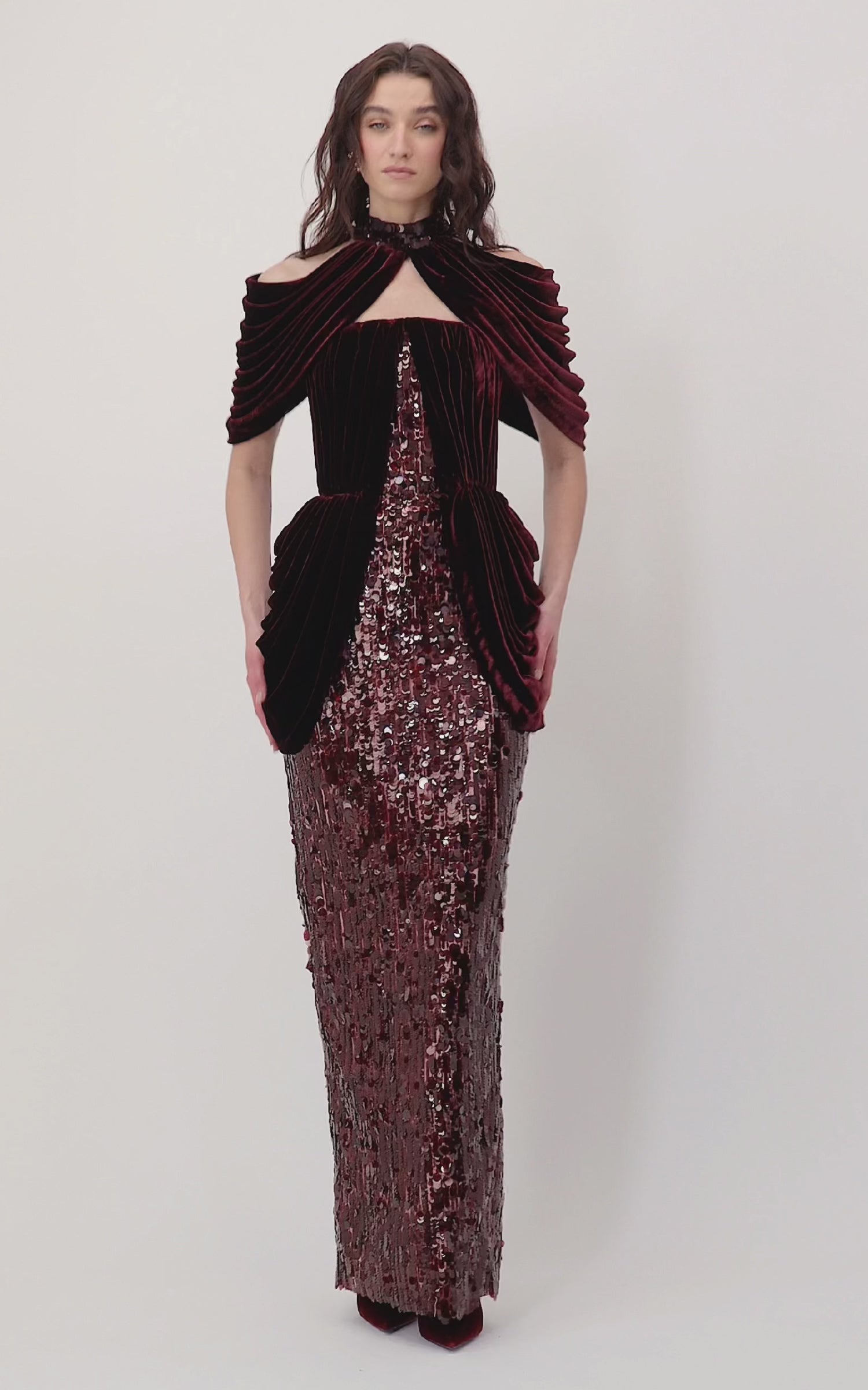 Cherry red sequin fitted gown accented with a plush silk velvet drape across the bust, cascading fluidly around the waist. The gown comes a velvet bolero with a sequined collar and sculptural drape that elegantly circles the shoulders. A statement layering piece that adds refined drama and sophistication to any evening ensemble.