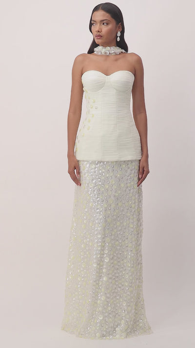Delicate and luminous, this gown features a pleated tulle corset with subtle side embellishments, paired with a fully embellished skirt that shimmers with every step. Rendered in soft butter yellow and light silver tones, it’s a dreamy blend of elegance and radiance. Sold with a neck scarf.