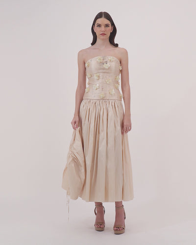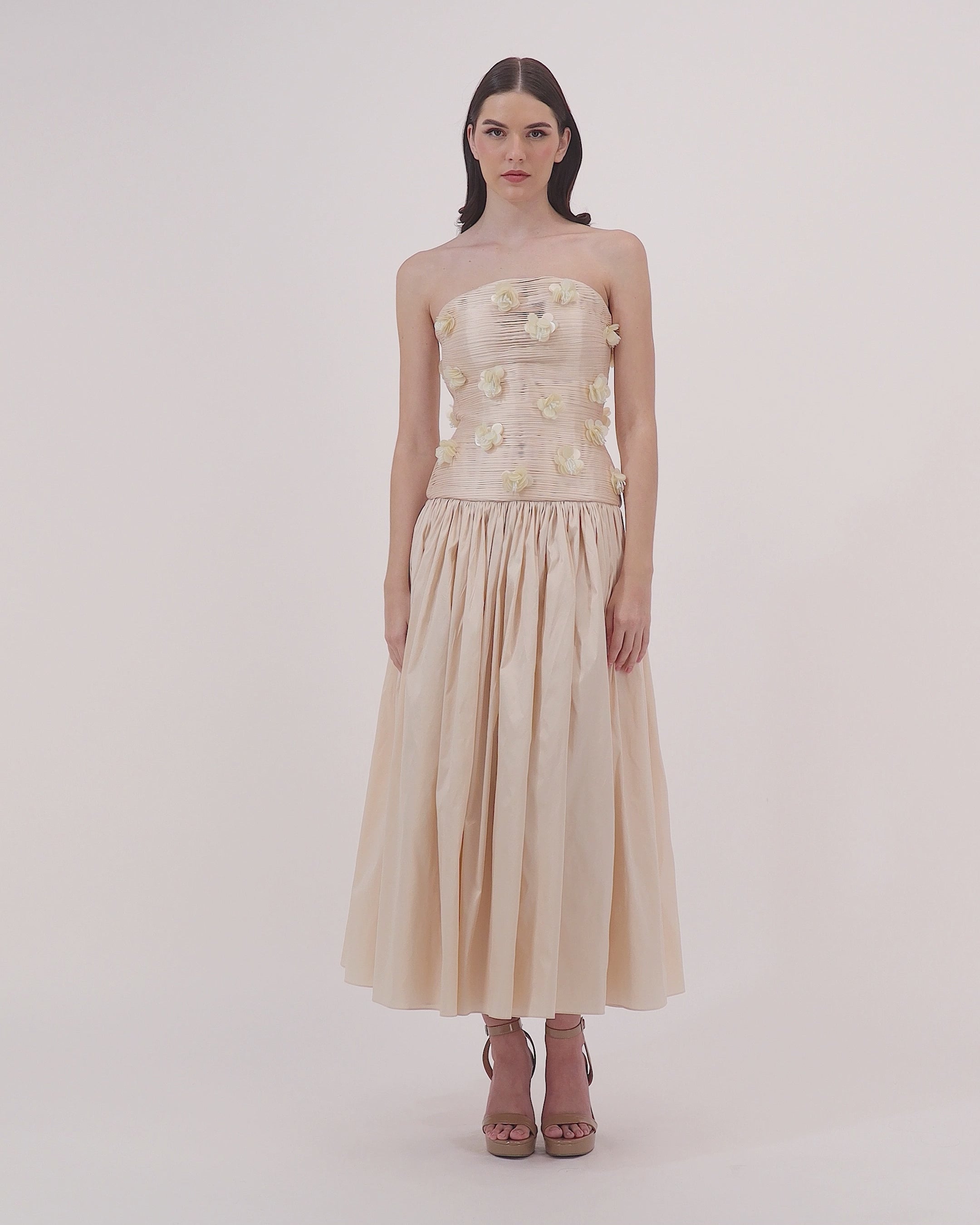 A maxi sensation , offering a seamless blend of sass and timeless style. It is sculpted in the brand's signature light taffeta and adorned by hand sewn flowers.