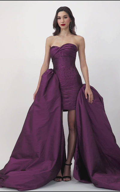 Purple pleated mini dress with voluminous floor-length drapes cascading from the sides. A striking blend of modern mini silhouette and dramatic movement, this statement gown is perfect for evening events, cocktail soirées, and red-carpet moments.