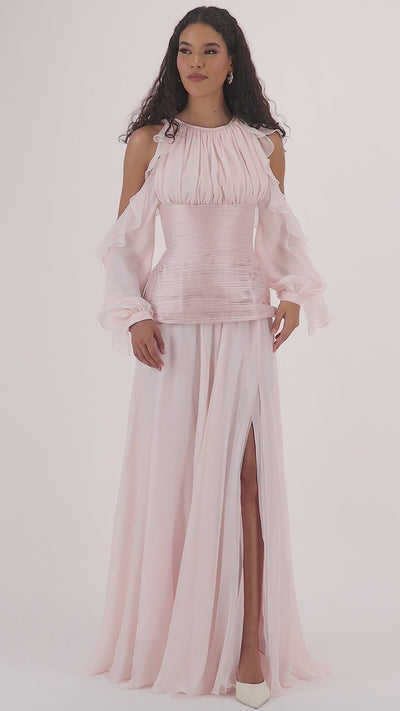 The 'Davi' gown is the statement gown. With our signature peplum bodice that accentuates an hourglass silhouette, adorned with layers of ruffled chiffon designed to captivate. The skirt, made from layers of pure silk chiffon, adds an airy elegance that's simply breathtaking.