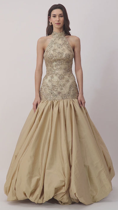 Shimmer with elegance in the exquisite 'Ethel' gown, designed to captivate at any grand occasion. The low-waist, backless bodice is adorned with delicate gold foil flower details, exuding luxury and artistry. Flowing into a voluminous skirt, this gown creates a dramatic yet graceful silhouette that commands attention. Perfect for making a glamorous statement.