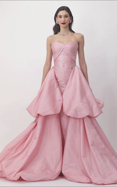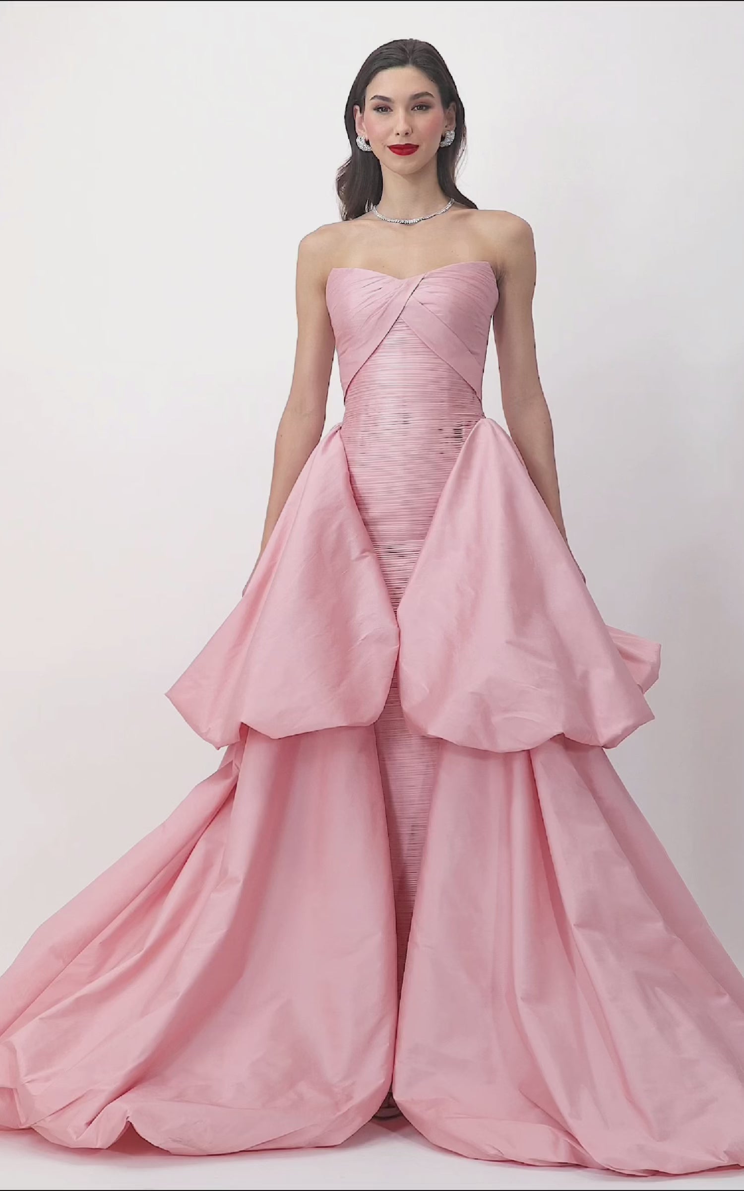 Our signature rose-pink pleated dress featuring voluminous drapes along the sides, blending structured tailoring with flowing fluidity for a modern fairytale effect. Romantic yet contemporary, this statement gown is perfect for evening events, formal soirées, and red-carpet moments.