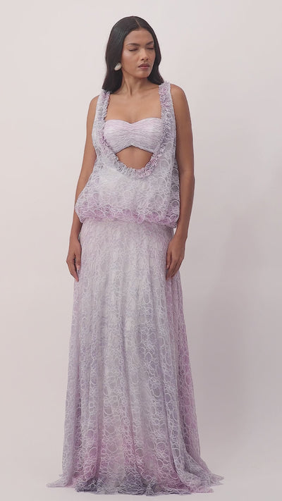 Romantic and free-spirited, this lace ombré gown stuns with its deep ruffled neckline and delicate low-waist silhouette. Featuring a soft, flowing skirt and an inner crop top for an alluring layered effect, it’s the perfect blend of bohemian elegance and modern femininity.