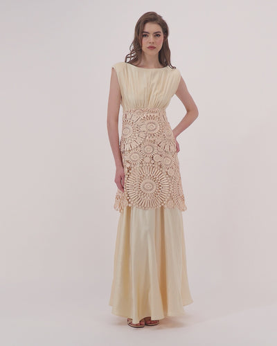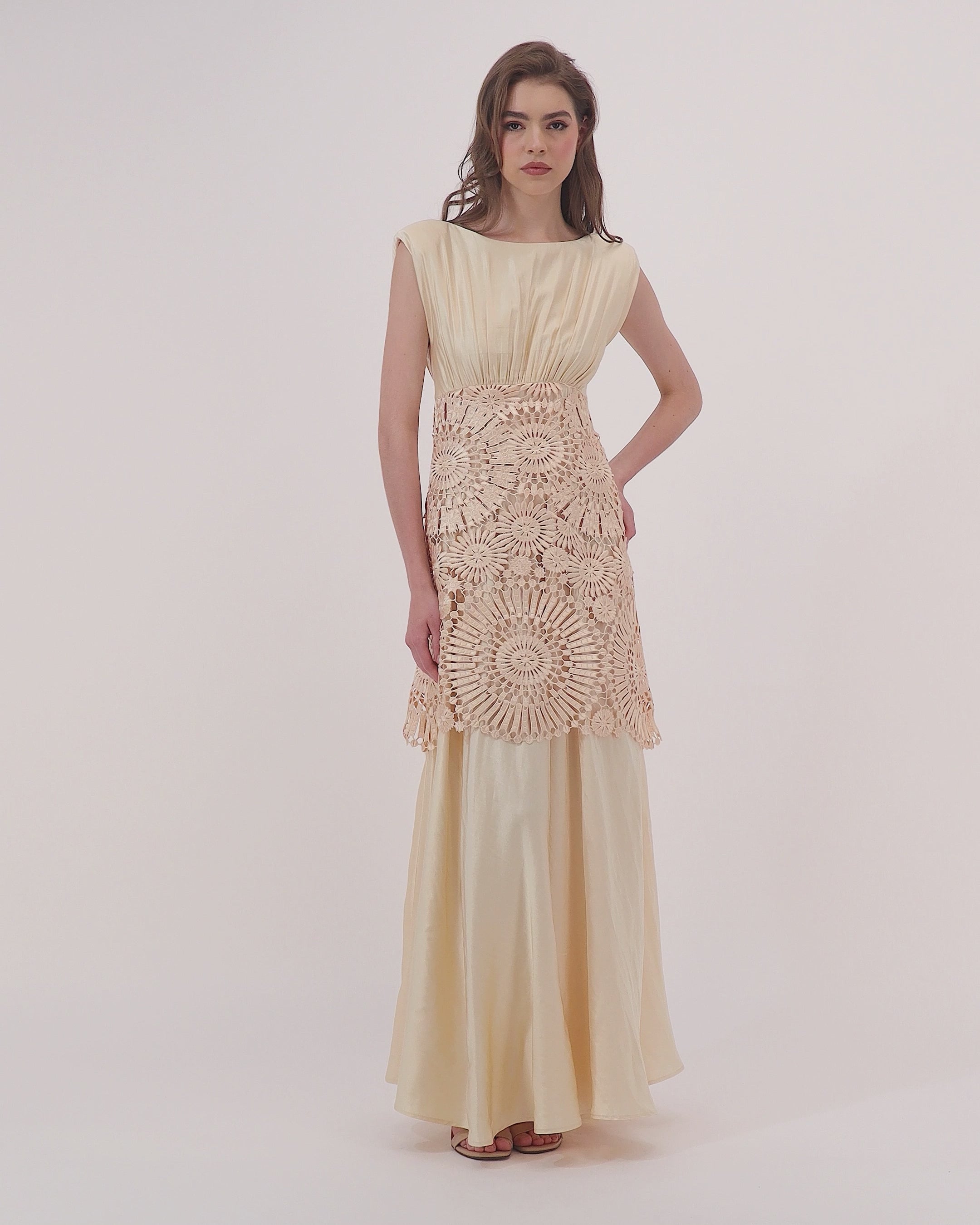 For the romantic side of you this maxi dress is a timeless piece crafted from luxurious glazed linen, designed to sweep you off your feet with its graceful A-line silhouette. The enchantment of this dress lies in its empire cut, accentuating your figure with the over layer of flowered mesh fabric. Prepare to feel like a vision of romance through the day or evening.