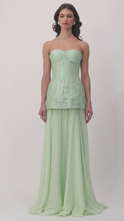 The 'Paisley'  is a statement gown. With our signature peplum bodice that accentuates an hourglass silhouette designed to captivate. The skirt, made from layers of pure silk chiffon, adds an airy elegance that's simply breathtaking.
