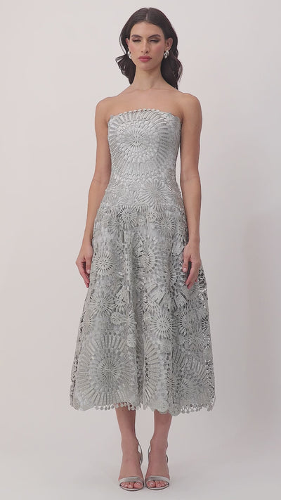 A dreamy midi dress, a masterpiece crafted from the finest embroidery tailored to embody elegance. This enchanting piece boasts an over layer of embroidery , delicately adorned with intricate floral motifs, adding a touch of romance to your night.