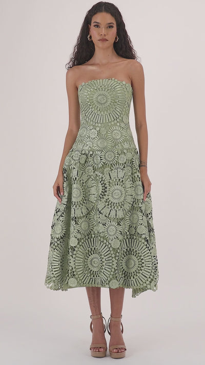 A dreamy midi dress, a masterpiece crafted from the finest embroidery tailored to embody elegance. This enchanting piece boasts an over layer of embroidery , delicately adorned with intricate floral motifs, adding a touch of whimsical romance to your night.