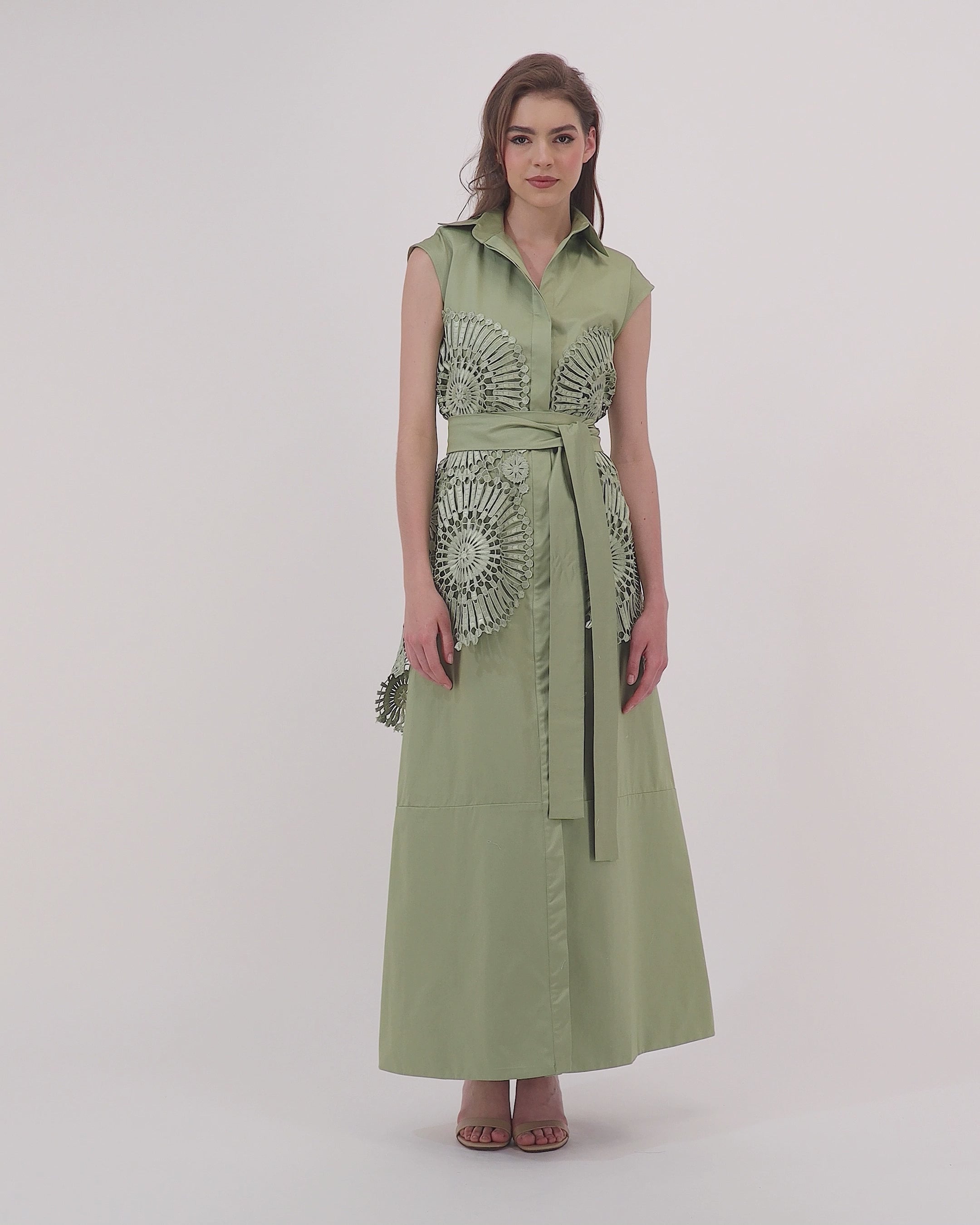 A dreamy maxi shirt dress, a masterpiece crafted from the finest pure cotton, tailored to embody elegance and comfort in equal measure. This enchanting piece boasts an over layer of embroidery , delicately adorned with intricate floral motifs, adding a touch of whimsical romance to your ensemble.