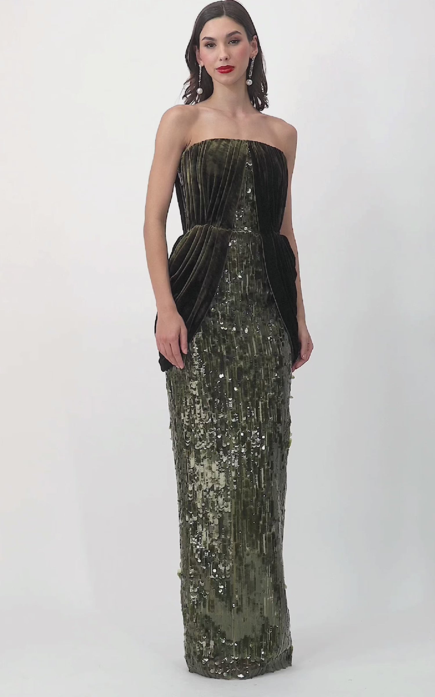 Olive green sequin fitted gown accented with a plush velvet drape across the bust, cascading fluidly around the waist. Designed to sculpt the figure with luminous texture and soft movement, this statement evening gown embodies bold elegance, perfect for formal events, galas, and red-carpet moments.