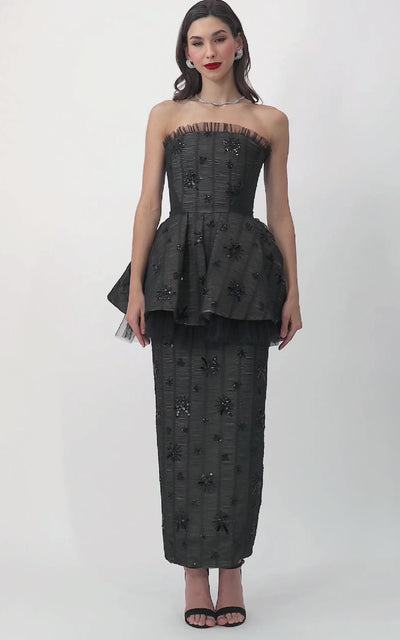 Black pleated tulle dress with intricate beading, featuring a dramatic bell-shaped peplum overlay. Fitted pencil-cut underskirt accentuates the silhouette, blending refined elegance with a daring, statement-making edge—perfect for evening galas, red-carpet events, and sophisticated soirées.