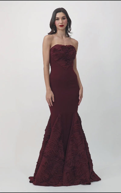 Maroon crepe gown featuring structured panels that sculpt a flattering fish-cut silhouette. Sleek and sophisticated, this statement gown exudes timeless elegance—perfect for weddings, evening parties, and formal occasions.