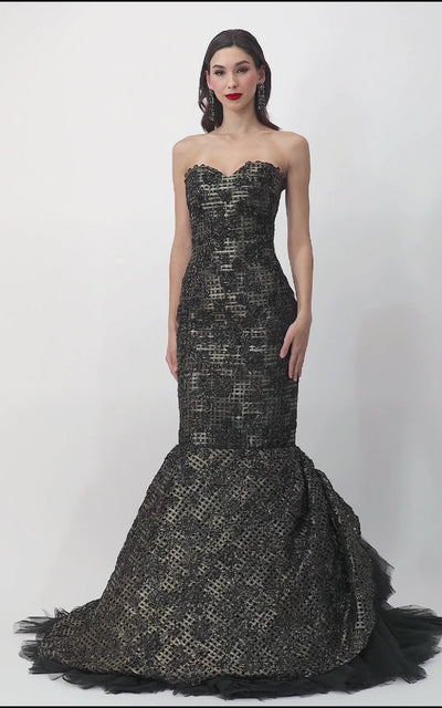 Black-gold mermaid gown with a draped skirt and tulle underlay for added volume. Sculpted to accentuate the silhouette, this statement gown radiates opulent glamour and refined sophistication—perfect for galas, red-carpet events, and formal soirées.