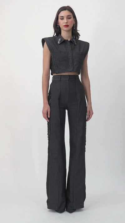 Charcoal grey denim vest featuring double-stitch detailing and a buckle-accented collar. A structured and edgy piece that elevates casual dressing, perfect for daytime events, smart-casual outings, and modern street-style ensembles.